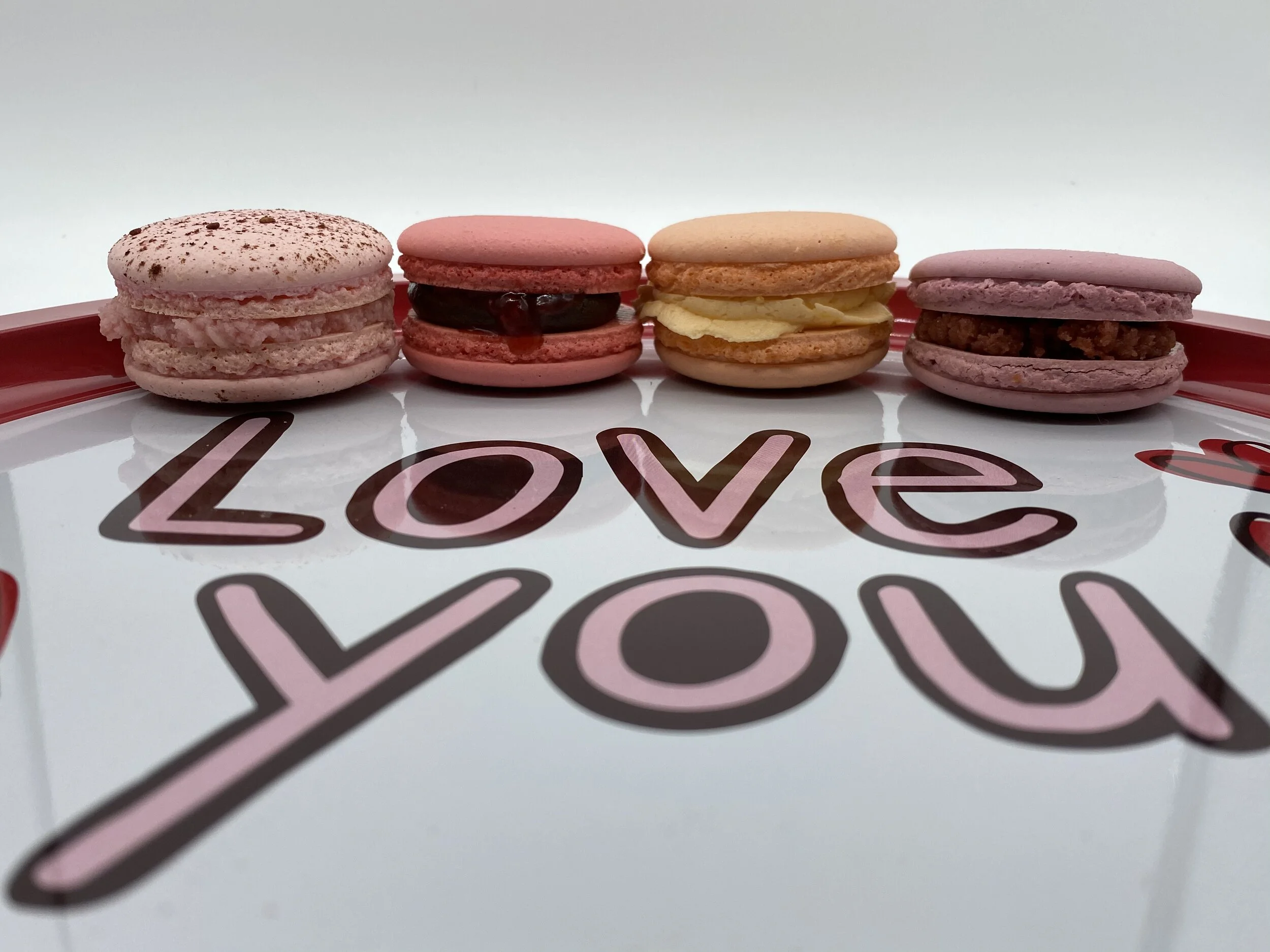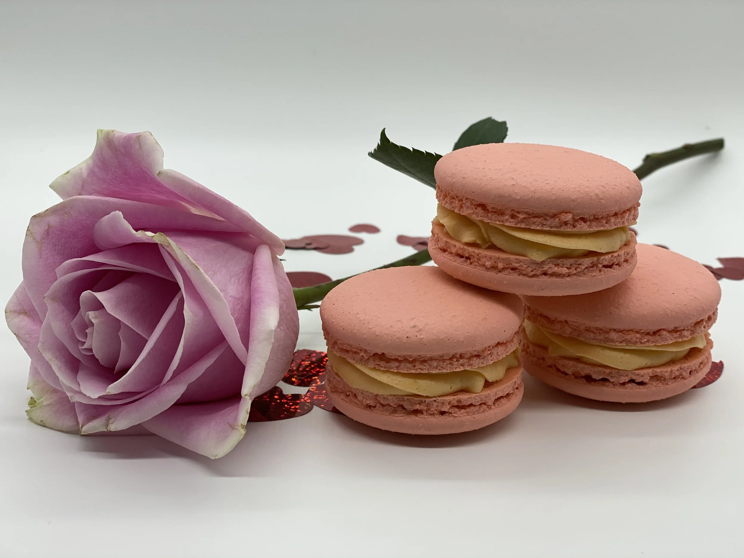For our next flavor, we wanted something bold and bright - and what better way to do that than to add some booze, right? Don’t worry though, the raspberry champagne macs are still recommended for all ages since we cook the champagne with some fresh raspberries to reduce out the alcohol content. Then we add the awesome sauce to our traditional buttercream base and voilà, you can toast with your sweetheart over these cute cookies.